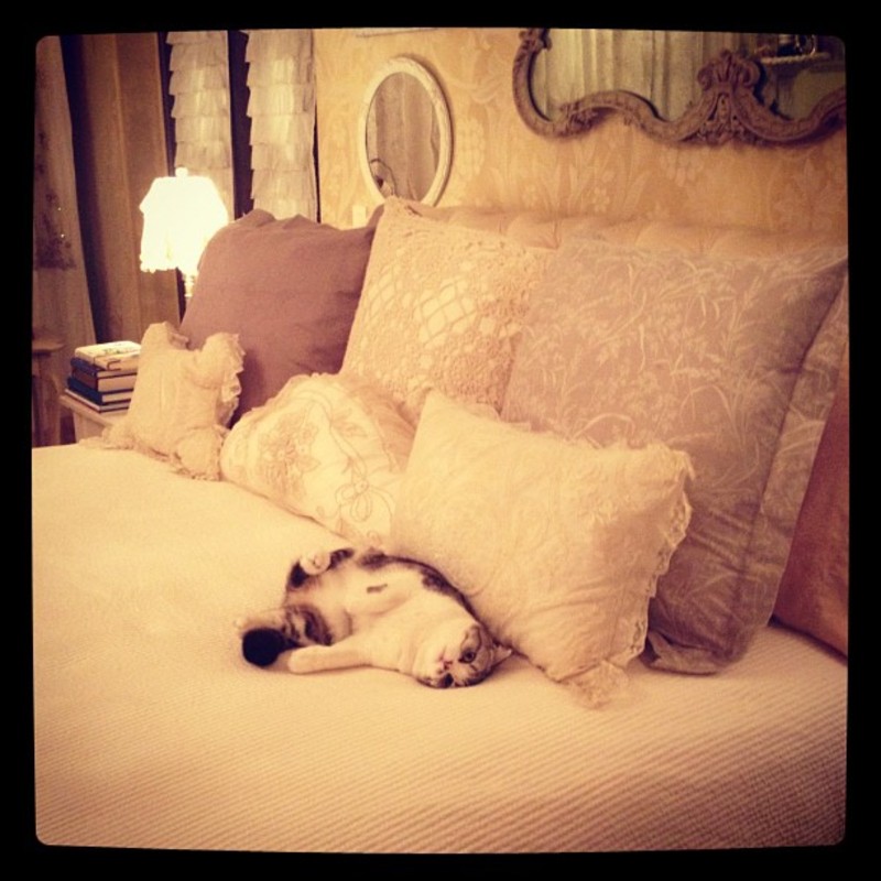 "I moved in the beginning of the summer. I've been working on this condo in Nasvhille about a year, doing construction. When I walked in, it was really trendy, and I eventually fell in love with it. But the inside of it was like a dude's bachelor ... and I was like, we need to change this and make it cozy and pretty and mismatched! So we ripped out everything [and] put in like barn, hardwood floors, old reclaimed brick ... And the kitchen! Oh my God, I love my kitchen! It's got mismatched colored cabinets and mismatched knobs on cabinets and mismatched chairs ... but it's very girly, and they're well-matched mismatched! There's lots of pillows everywhere."